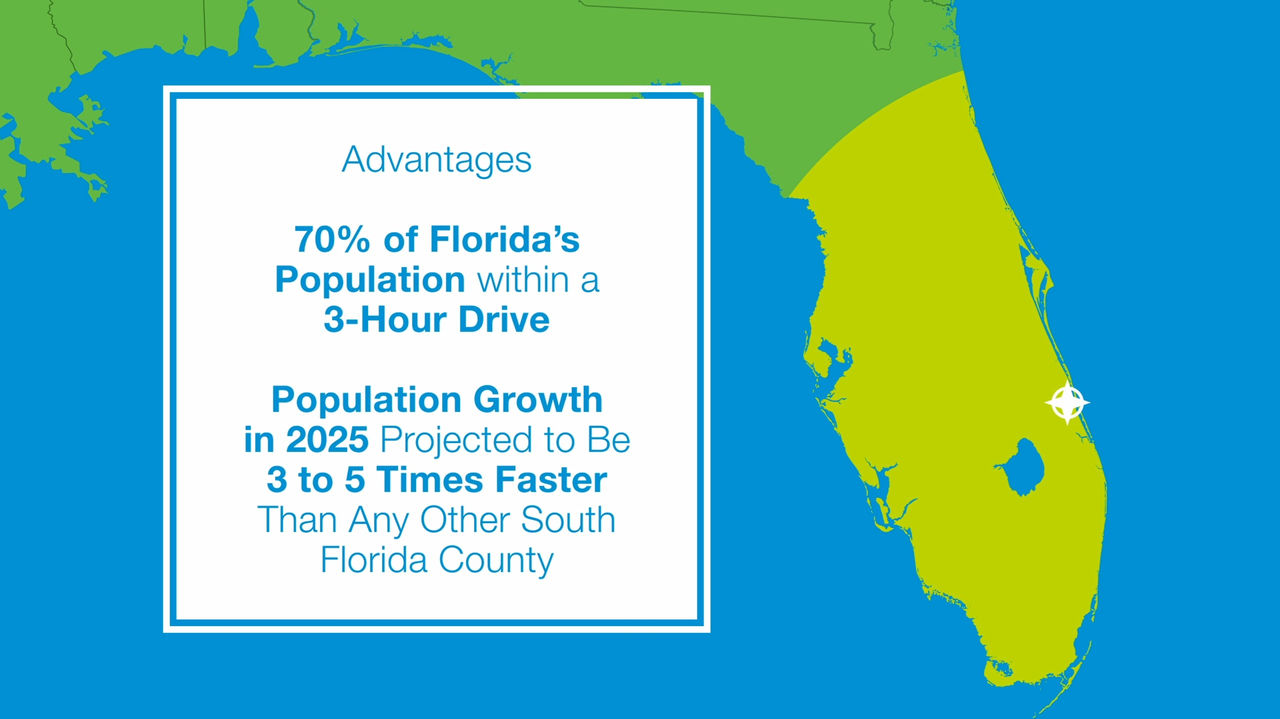 St. Lucie County is home to Florida's 6th largest city - Port St. Lucie. The Port St. Lucie metro area was the 5th fastest-growing MSA in the U.S. between July 2022 and July 2023 according to the U.S. Census Bureau. With immediate access to both Interstate 95 and Florida’s Turnpike, it’s a 3-hour or less drive to 70% of Florida’s population. St. Lucie County is a truly beautiful place to live with 21 miles of pristine coastline and beaches, more than 20,000 acres of public parks and natural preserves, vibrant arts and entertainment venues and much more.
